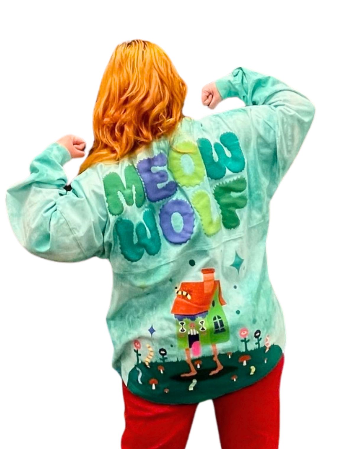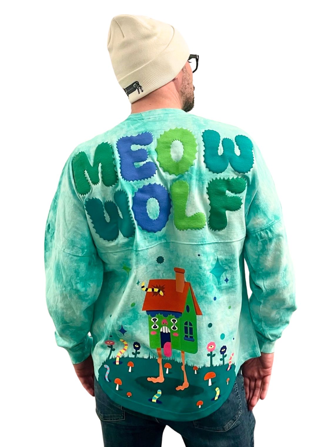 Get ready for the strange! This official Meow Wolf “Home on the Strange” Spirit Jersey, made in partnership with Spirit Jersey, is the comfiest way to bring the multiverse home. Dive into the dreamy, vibrant blue tie-dye fabric of this oversized long sleeve shirt. The front features a small Meow Wolf logo on the chest, reimagined in mystical shades of blue and green. Flip the script (and the jersey!) to reveal the main event: a breathtaking, oversized back print. It combines a repeat of the same Meow Wolf logo that spans shoulder to shoulder, with the mind-bending “Home on the Strange” artwork. It’s an instant portal to the weird, wild, and wonderful. Perfect for cozy exploration, spontaneous road trips, or simply declaring your allegiance to the strange!